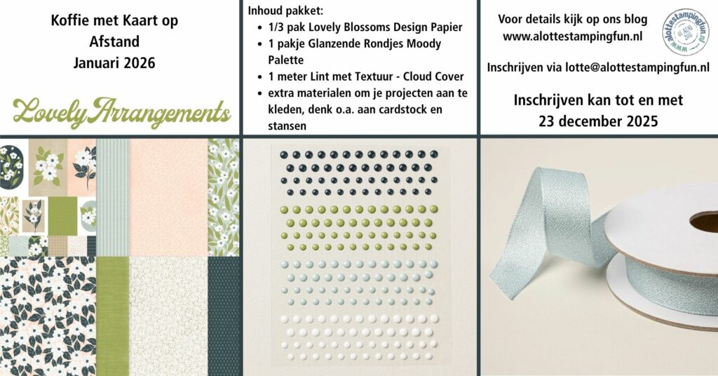 Ook in 2026 gaan we natuurlijk ook weer door met Koffie met Kaart op Afstand. Wanneer je je inschrijft, ontvang je een pakket met Stampin’ Up! producten uit een bepaalde suite en elke donderdag om 10 uur is er een video (of live op Facebook en daarna te bekijken op YouTube of vooraf opgenomen) waarin Lotte je het project van die dag laat zien en het stap voor stap met je maakt.