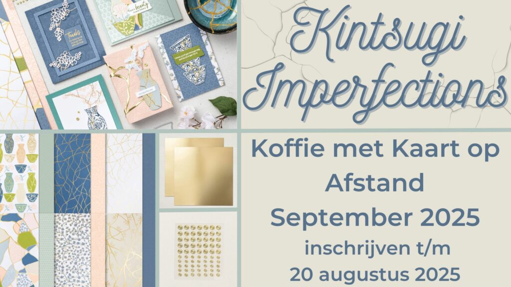 Het Koffie met Kaart op Afstand workshop pakket met daarbij het Kintsugi Inspirations collectie pakket (DSP, stempelset, stansen, steentjes en de embossingfolder) € 104,00
